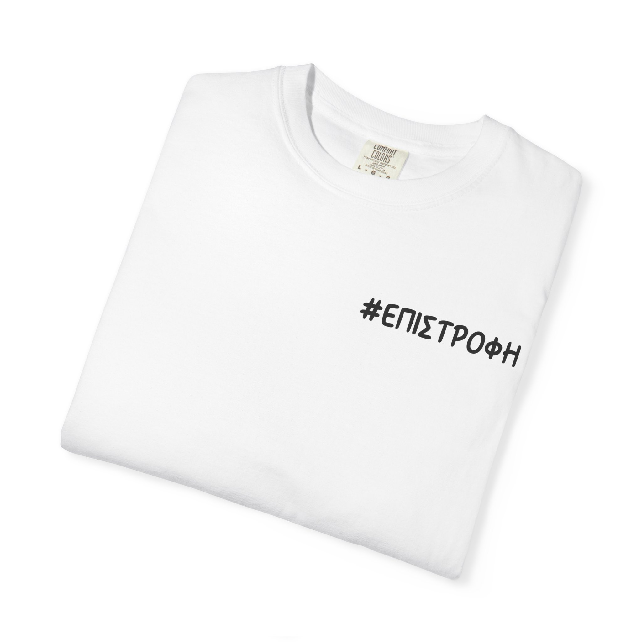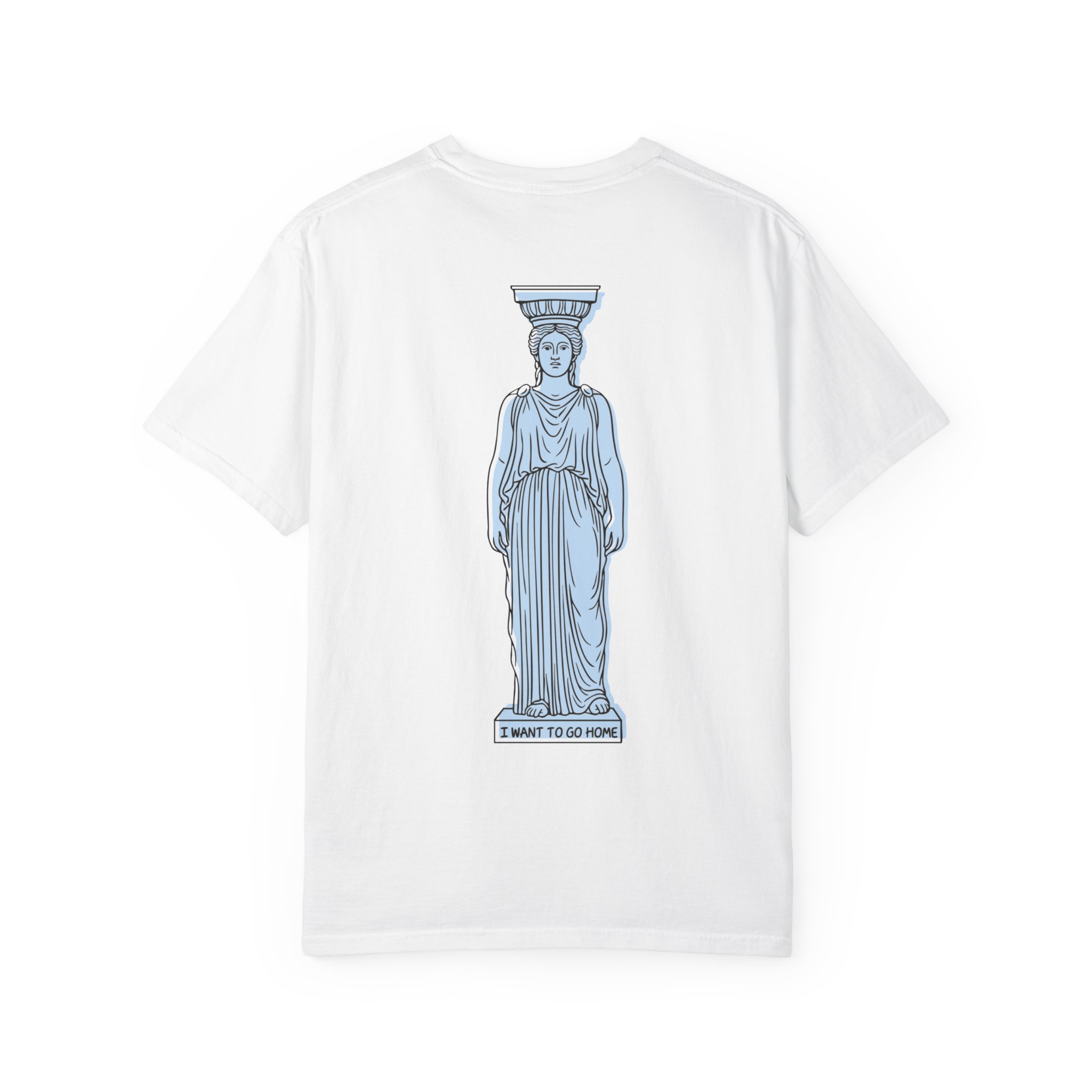 This garment speaks like a quiet, late-night conversation with your favorite city ruins. The front carries the Greek word “epistrofi” — return — a small, deliberate reminder of coming back to where you belong. At the back, a caryatid looks out, a stone woman whispering “I want to go home.” Wear it when you want clothing that holds a story: for slow walks through museum halls, for evenings with friends who understand longing, for flights and train rides when you fold memory into your bag. The soft, garment-dyed cotton and relaxed cut settle around you without shouting. It ages into the person who wears it, the colors mellowing as the idea — return, belonging, home — grows louder. This tee resonates with anyone who carries a place in their chest and moves through cities and rooms collecting fragments of home.