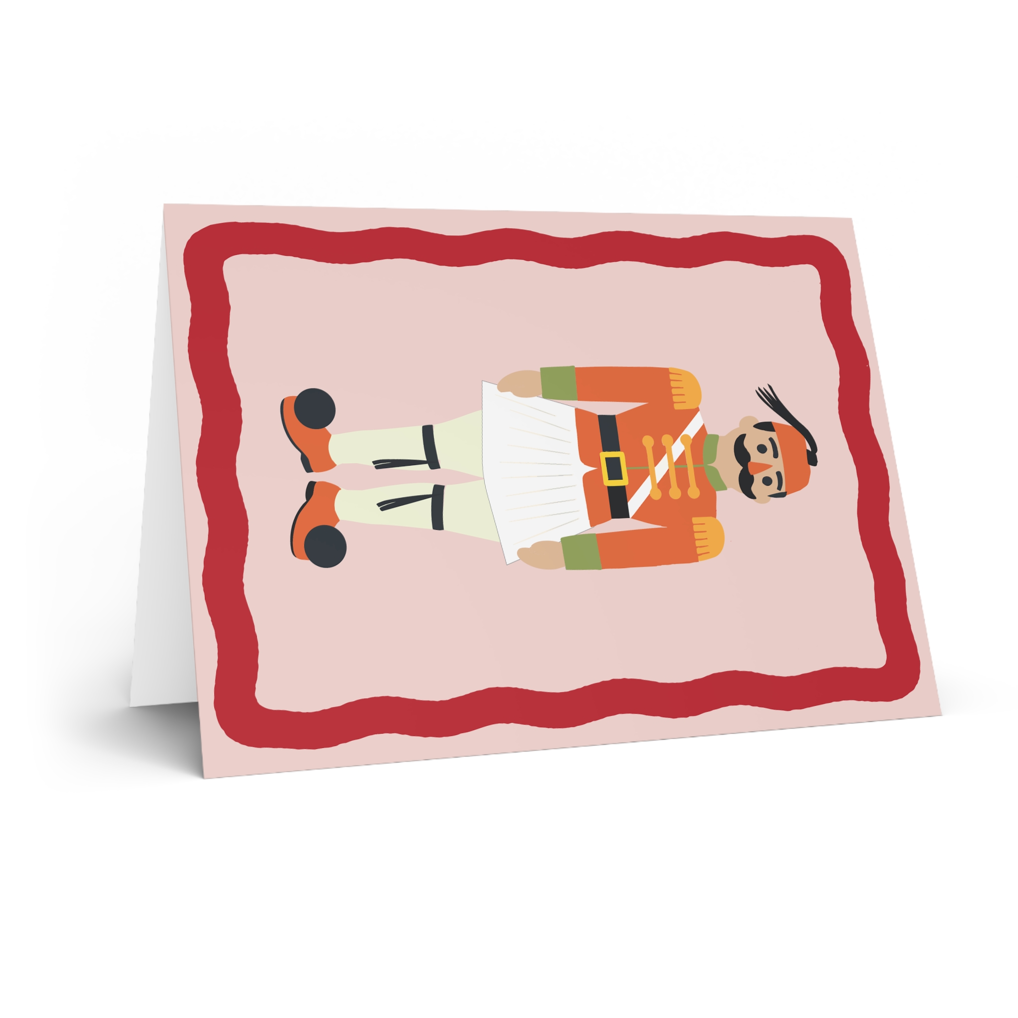 A cheerful, hand-drawn greeting card that brings vintage holiday theater charm to small moments. The front shows a proud toy-soldier figure framed by a playful, wavy red border on a soft pink background. Inside is left blank for your own heartfelt note, or printed with a short message if you prefer. The card feels tactile and thoughtful in hand — the thick stock and vivid inks make the colors pop, while the choice of glossy or matte finish lets you tune the mood from bright and festive to soft and elegant. Send it to someone who loves nostalgic whimsy, seasonal décor, or little keepsakes that live on mantels and in memory boxes.